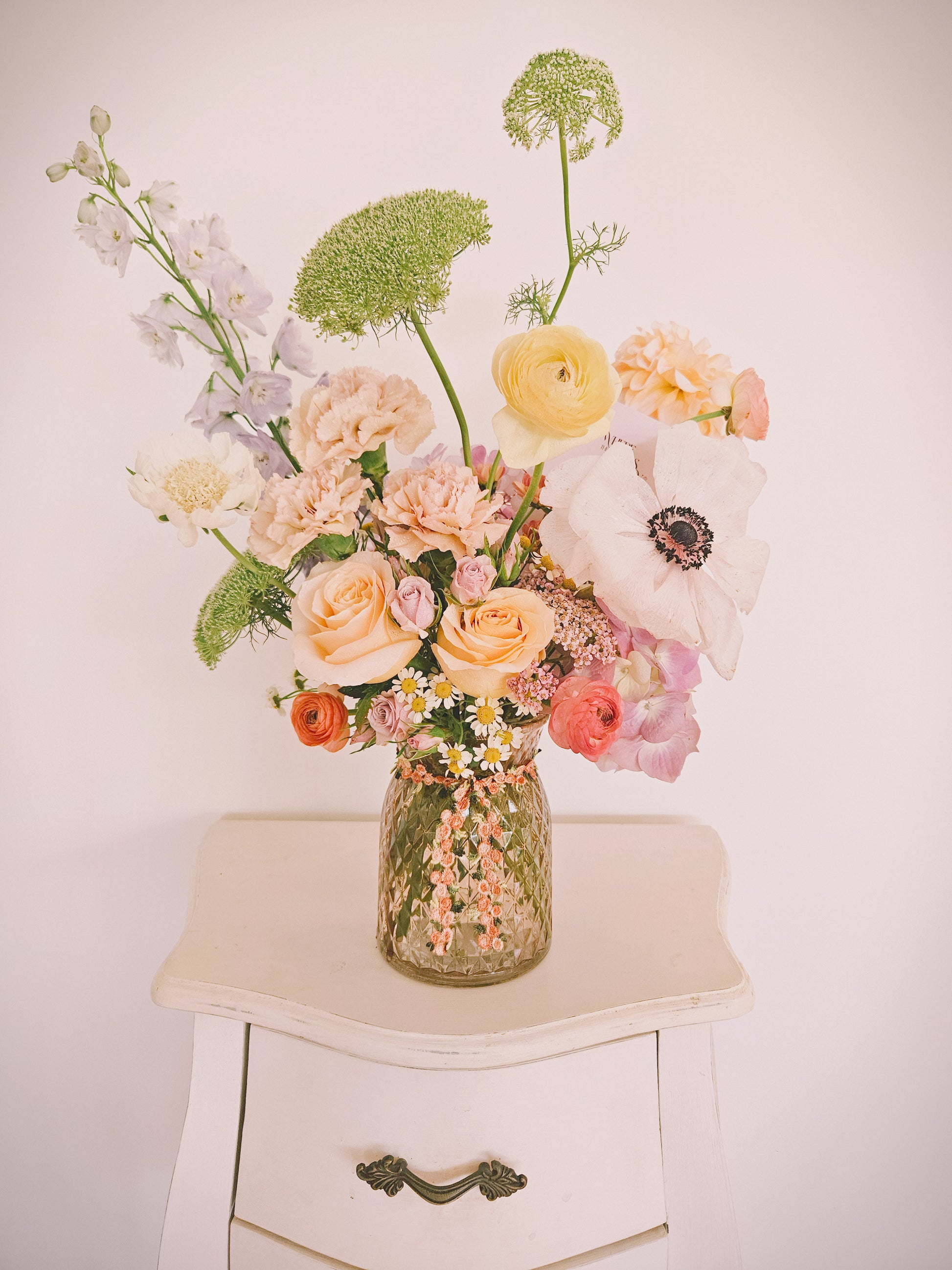 A beautiful blend of seasonal blooms in warm peach, blush and buttercream tones are thoughtfully arranged in a textured glass vessel, creating a design that feels abundant yet effortlessly natural. Delicate layers of flowers and whimsical stems give the arrangement its signature cottage-garden charm.