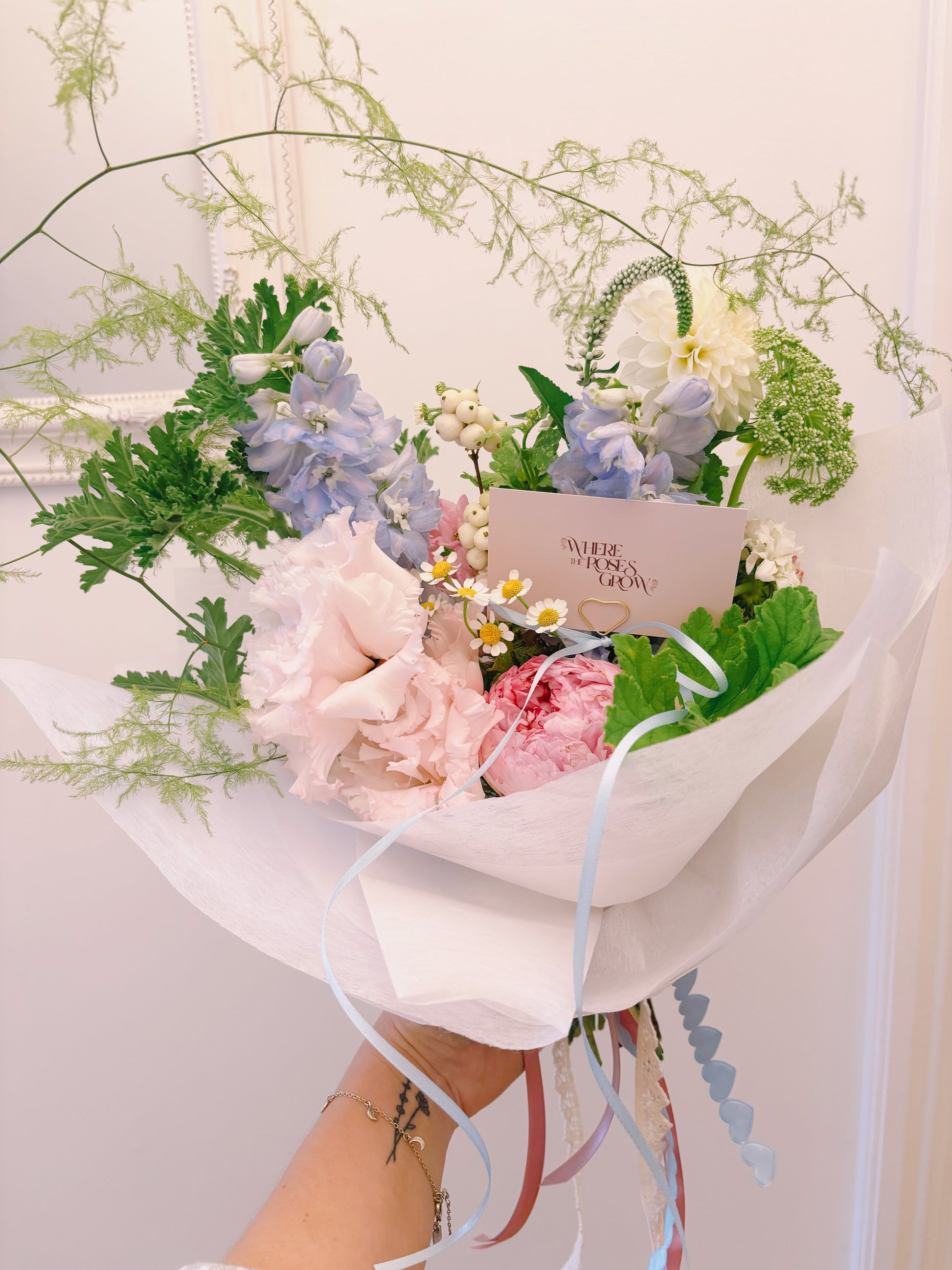Finished in layers of soft wrap and tied with flowing ribbons, The Jemima embodies the Where the Roses Grow signature — romantic, whimsical and effortlessly beautiful.
