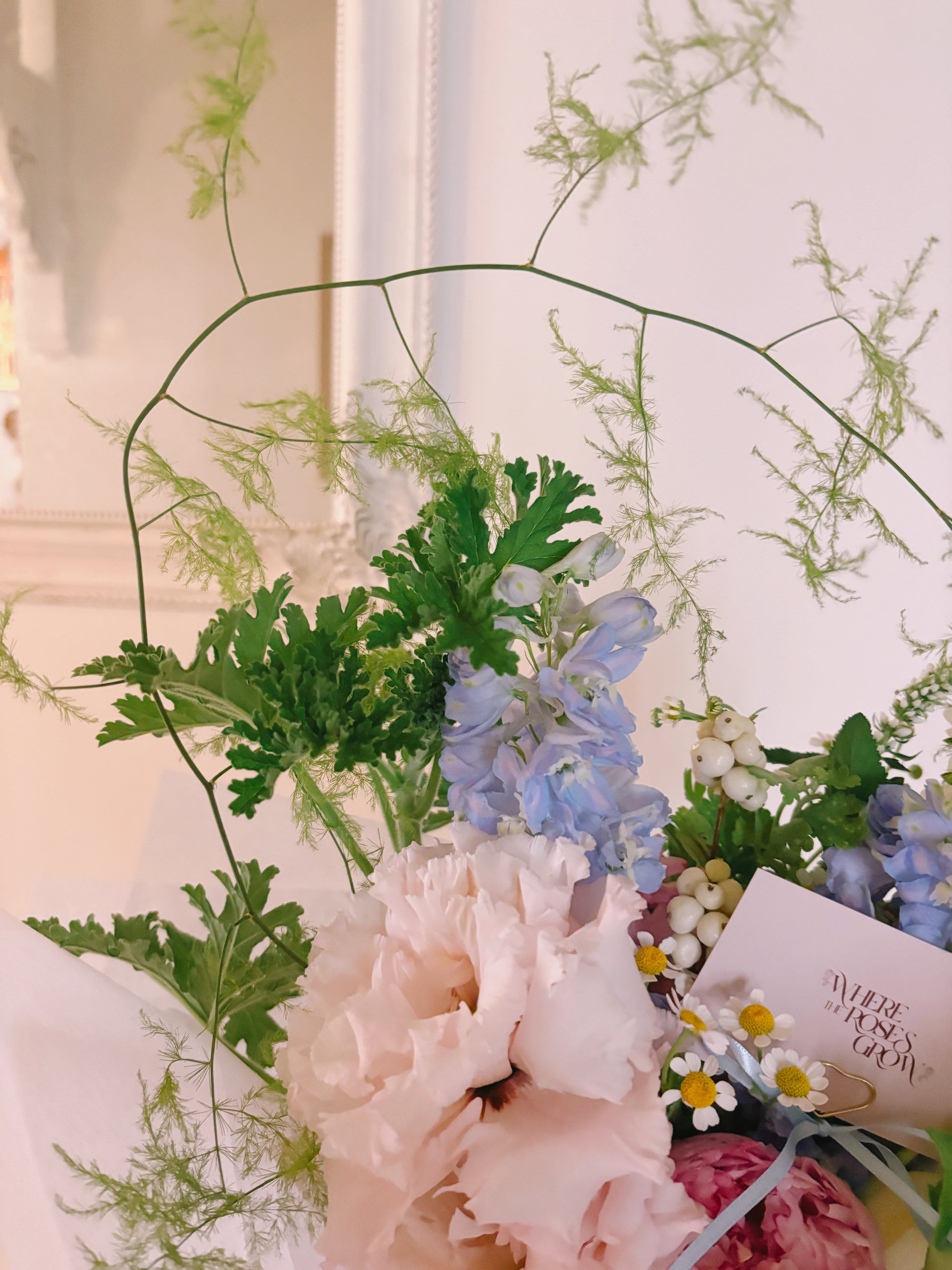 Her signature feature is the delicate asparagus fern arch — a naturally sculptural element that creates an ethereal, almost halo-like shape above the bouquet. It brings a sense of movement and something a little unexpected, making The Jemima feel truly special and one of a kind.